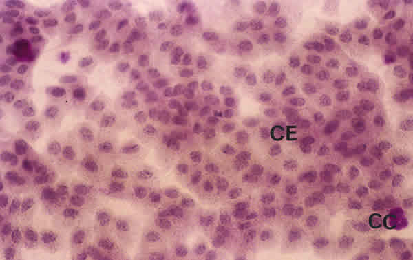 CITOLOGÍA DE IMPRESIÓN EN UN PACIENTE CON SS1-GRADO II. LA DENSIDAD DE LAS CÉLULAS CALICIFORMES ES PEQUEÑA (CC). LAS CÉLULAS EPITELIALES (CE) TIENEN MAYOR TAMAÑO QUE EN EL GRADO ANTERIOR Y ESTÁN MODERADAMENTE SEPARADAS. TINCIÓN PAS-HEMATOXILINA. MAGNIFICACIÓN ORIGINAL X40.