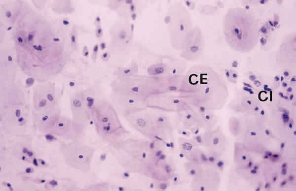 CITOLOGÍA DE IMPRESIÓN EN UN PACIENTE CON SS1-GRADO III. LAS CÉLULAS CALICIFORMES HAN DESAPARECIDO EN LA MAYORÍA DE LAS MUESTRAS. LAS CÉLULAS EPITELIALES (CE) SON GRANDES Y GENERALMENTE AISLADAS. LAS CÉLULAS INFLAMATORIAS (CI) SUELEN ESTAR PRESENTES EN ESTE GRADO DE SEVERIDAD. TINCIÓN PAS-HEMATOXILINA. MAGNIFICACIÓN ORIGINAL X40.