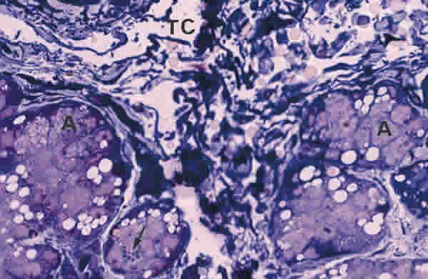 BIOPSIA EN UN PACIENTE CON QCS-GRADO III. LOS ACINOS (A) DE LA GLÁNDULA LAGRIMAL PRINCIPAL ESTÁN CONSTITUIDOS POR CÉLULAS MUY ALTERADAS CON ESCASO NÚMERO DE GRÁNULOS DE SECRECIÓN (FLECHA ARRIBA). eL TEJIDO CONECTIVO INTERSTICIAL (TC) ES AMPLIO Y DENSO. TINCIÓN AZULES DE RICHARDSON. MAGNIFICACIÓN ORIGINAL X100.