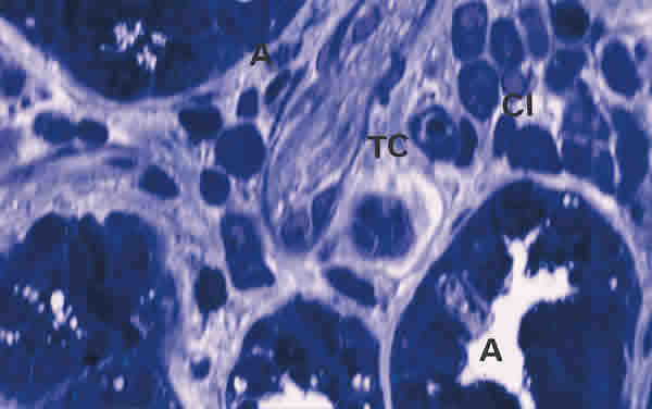 BIOPSIA EN UN PACIENTE CON SS1-GRADO III. LA GLÁNDULA LAGRIMAL PRINCIPAL TIENE ACINOS (A) CONSTITUIDOS POR CÉLULAS MUY ALTERADAS CON ESCASO NÚMERO DE GRÁNULOS DE SECRECIÓN. EL TEJIDO CONECTIVO INTERSTICIAL (TC) ES AMPLIO Y MUY DENSO, CON NUMEROSAS CÉLULAS INFLAMATORIAS (CI). TINCIÓN AZULES DE RICHARDSON. MAGNIFICACIÓN ORIGINAL X100.