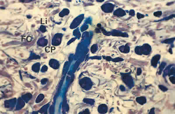 BIOPSIA EN UN PACIENTE CON SS1-GRADO I. EL TEJIDO CONECTIVO QUE RODEA A LA GLÁNDULA LAGRIMAL TIENE UN MODERADO NÚMERO DE FIBRAS DE COLÁGENO (FC), ESCASO NÚMERO DE LINFOCITOS (Li) Y ABUNDANTES CÉLULAS PLASMÁTICAS (CP). TINCIÓN AZULES DE RICHARDSON. MAGNIFICACIÓN ORIGINAL X100.