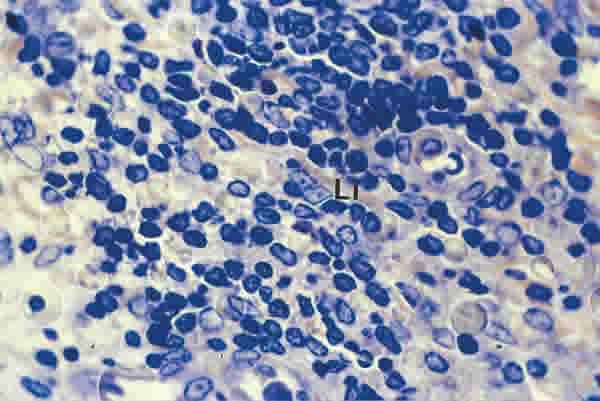 BIOPSIA EN UN PACIENTE CON SS1-GRADO III. EL TEJIDO CONECTIVO PERIGLANDULAR ESTÁ REPLETO DE LINFOCITOS (Li). TINCIÓN AZULES DE RICHARDSON. MAGNIFICACIÓN ORIGINAL X100.