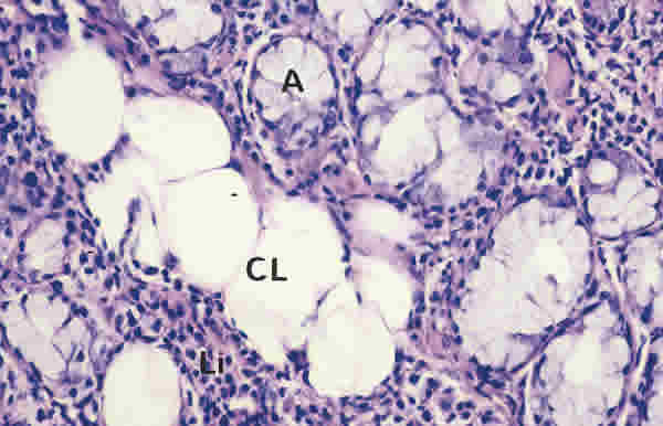 BIOPSIA EN UN PACIENTE CON SS1-GRADO III. LOS ACINOS GLANDULARES (A) ESTÁN CONSTITUIDOS POR CÉLULAS ALTERADAS SIN GRÁNULOS DE SECRECIÓN. EL TEJIDO CONECTIVO INTERSTICIAL (TC) ESTÁ OCUPADO TOTALMENTE POR NUMEROSOS LINFOCITOS (Li). SE OBSERVAN ABUNDANTES CÉLULAS LIPÍDICAS (CL). TINCIÓN AZULES DE RICHARDSON. MAGNIFICACIÓN ORIGINAL X100.