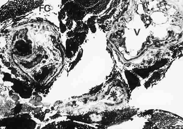BIOPSIA EN UN PACIENTE CON SS1-GRADO III. SE OBSERVAN VASOS CAPILARES (V), PRÓXIMOS A LA GLÁNDULA LAGRIMAL, MUY ALTERADOS, CON ESTRUCTURAS DE NEOFORMACIÓN DE VASOS SANGUÍNEOS (*). LAS FIBRAS DE COLÁGENO (FC) SON MUY ABUNDANTES. MICROSCOPIA ELECTRÓNICA. MAGNIFICACIÓN ORIGINAL X4000.
