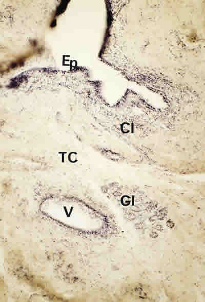 BIOPSIA EN UN PACIENTE CON SS1-GRADO I. LAS CÉLULAS INFLAMATORIAS (CI) ESTÁN DISPERSAS POR TODO EL TEJIDO CONECTIVO (TC), ALREDEDOR DE LOS VASOS SANGUÍNEOS (V), EN POSICIÓN SUBEPITELIAL (Ep) Y ALREDEDOR DE LOS ACINOS GLANDULARES (GD). TINCIÓN H-E. MAGNIFICACIÓN ORIGINAL X20.