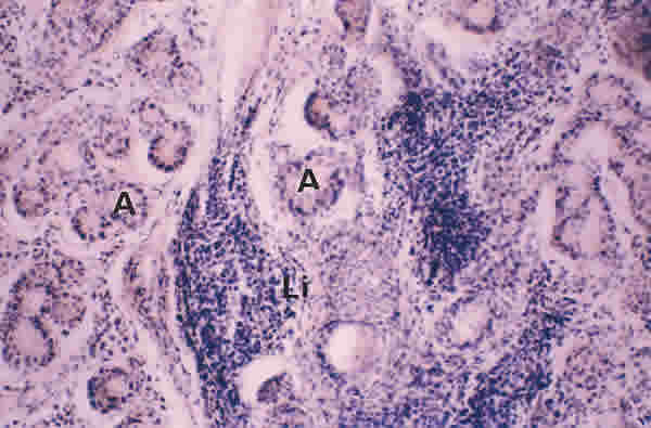BIOPSIA EN UN PACIENTE CON SS1-GRADO II. LOS LINFOCITOS (Li) ESTÁN LOCALIZADOS EN PEQUEÑOS ACÚMULOS ENTRE LOS ACINOS GLANDULARES (A). TINCIÓN H-E. MAGNIFICACIÓN ORIGINAL X40.