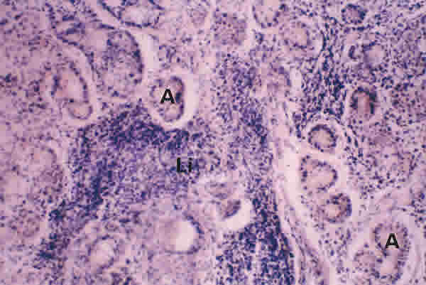 BIOPSIA EN UN PACIENTE CON SS1-GRADO III. LOS LINFOCITOS (Li) SE DISPONEN, EN GRANDES ACÚMULOS, ENTRE LOS ACINOS GLANDULARES (A). TINCIÓN H-E. MAGNIFICACIÓN ORIGINAL X40.