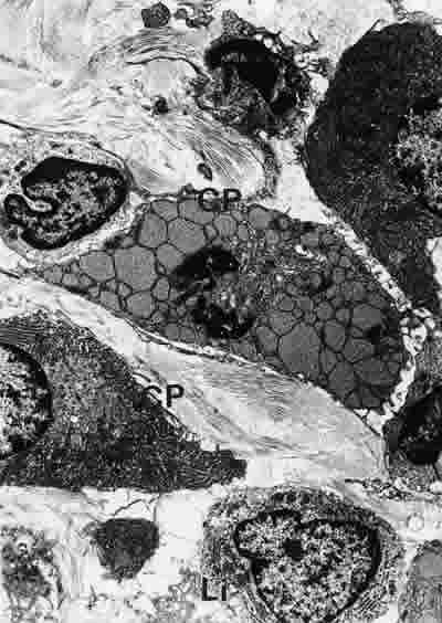 BIOPSIA EN UN PACIENTE CON SS1-GRADO I. SE OBSERVAN CÉLULAS PLASMÁTICAS (CP) CON GRANDES CISTERNAS DE REr MUY ELECTRODENSAS Y LINFOCITOS (Li) CON ABUNDANTES ORGÁNULOS SUBCELULARES. EL TEJIDO ES LAXO. MICROSCOPIA ELECTRÓNICA. MAGNIFICACIÓN ORIGINAL X3000.