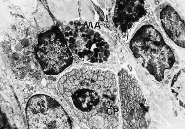 BIOPSIA EN UN PACIENTE CON SS1-GRADO I. SE OBSERVA GRAN NÚMERO DE CÉLULAS PLASMÁTICAS (CP) CON ABUNDANTE MATERIAL ELECTRODENSO DENTRO DE GRANDES CISTERNAS DE REr, Y MASTOCITOS (MA) CON ABUNDANTES GRÁNULOS. MICROSCOPIA ELECTRÓNICA. MAGNIFICACIÓN ORIGINAL X4000.