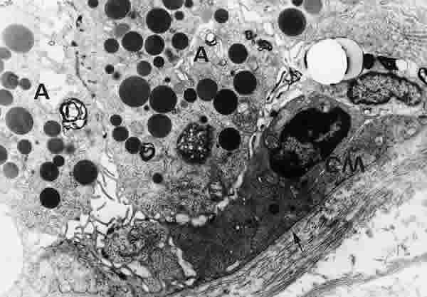 BIOPSIA EN UNA PERSONA CONTROL. EN EL POLO BASAL DE LAS CÉLULAS ACINARES (A) EXISTE GRAN CANTIDAD DE GRÁNULOS DE SECRECIÓN Y ABUNDANTES ORGÁNULOS SUBCELULARES. SE OBSERVA UNA CÉLULAS MIOEPITELIAL (CM). LA MEMBRANA BASAL (FLECHA ARRIBA) ES ANCHA Y CONTINUA. MICROSCOPIA ELECTRÓNICA. MAGNIFICACIÓN ORIGINAL X5000.