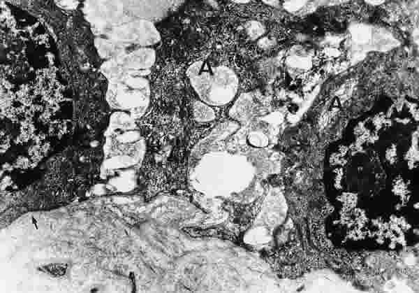 BIOPSIA EN UN PACIENTE CON SS1-GRADO III. LAS CÉLULAS ACINARES (A) ESTÁN MUY SEPARADAS Y ALTERADAS, CON ESCASOS ORGÁNULOS SUBCELULARES, ABUNDANTE CANTIDAD DE MATERIAL FIBRILAR (*) Y CON AUSENCIA DE GRÁNULOS DE SECRECIÓN. EL POLO BASAL DE LAS CÉLULAS ES IRREGULAR. LA MEMBRANA BASAS (FLECHA ARRIBA) ES DISCONTINUA. MICROSCOPIA ELECTRÓNICA. MAGNIFICACIÓN ORIGINAL X8000.