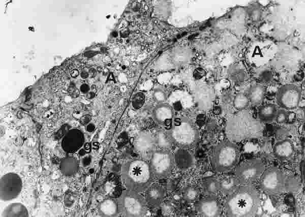 BIOPSIA EN UN PACIENTE CON SS1-GRADO III. LOS GRÁNULOS DE SECRECIÓN (gs) EN LAS CÉLULAS ACINARES (A) SUELEN ESTAR VACÍOS (*). EN LAS POCAS CÉLULAS QUE NO PRESENTAN ESTA CARACTERÍSTICA ES FRECUENTE OBSERVAR GRÁNULOS DE SECRECIÓN MUY HETEROGÉNEOS. MICROSCOPIA ELECTRÓNICA. MAGNIFICACIÓN ORIGINAL X6000.
