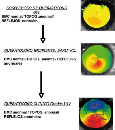 El QFF sería supuestamente, el primer escalón en la evolución natural de un queratocono (fig. 1). La BMC y reflejos retinianos son normales, solo existen las anomalías topográficas. El siguiente paso, Queratocono incipiente o «early keratoconus» ya presenta sombras retinianas anormales pero sin hallazgos biomicroscópicos. Por último, llegaríamos al Queratocono clínico, con los conocidos signos biomicroscópicos (Estrías de Vogt, anillo de Fleischer, adelgazamiento...) y enlazaríamos con la clasificación clásica de 4 estadios de Amsler.