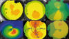 Para poder interpretar una topografía, debemos conocer los patrones topográficos descritos por Rabinowitz estudiando las topografías de 195 individuos sin patología conocida y no portadores de lentes de contacto (fig. 2). Los patrones más frecuentes fueron redondo, oval, botón de camisa simétrico y asimétrico. Los patrones en «j» encontrados por Rabinowitz al ser examinados en profundidad demostraron ser queratoconos incipientes (10). Hay que prestar atención siempre a los intervalos de las escalas empleados al valorar cualquier topografía. Se ha propuesto el empleo de escalas estándar con 1,5D de incremento y en las que el color amarillo represente valores de 43 a 44,5 D (11). En principio, la existencia de clara asimetría en la topografía de ambos ojos debe investigarse a fondo pues puede ser patológico.