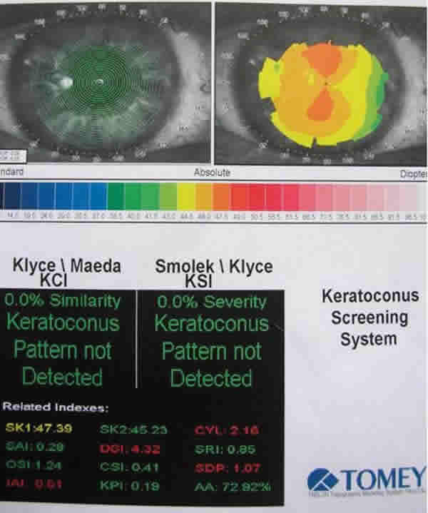 Klyce-Maeda, basado en una serie de índices (sim K, cyl, SAI, SRI, DSI, OSI, CSI, SDP, IAI, KPI, AA) nos da el «KCI» o «índice de queratocono», valor normal: 0%.