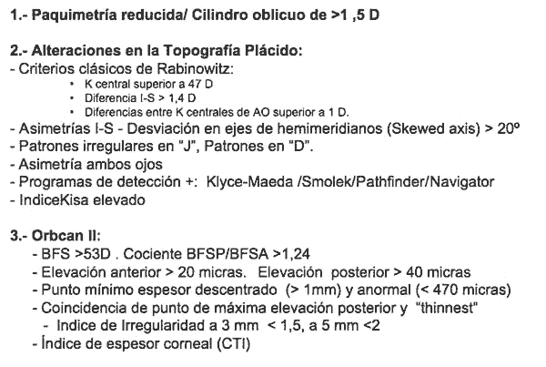 5. Rabinowitz-McDonnell (1989). Proponen sus criterios ya clásicos: K central > 47D, Valor I-S > 1,5 D y diferencia K central de ambos ojos > 1D 13. En 1995 se propone modificación a K central > 47,2 D y Valor I-S > 1,4 D (14).