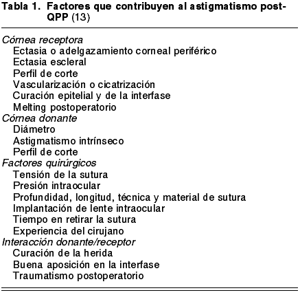 En la tabla 1 se relacionan los factores implicados más frecuentemente en el desarrollo de astigmatismo post-QPP.
