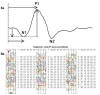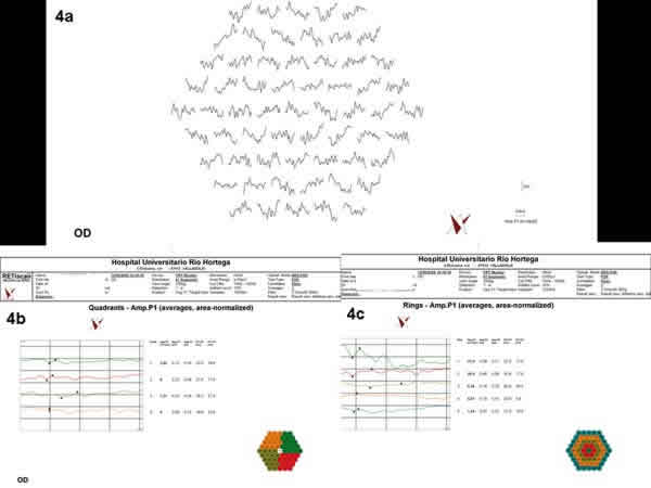 Trazado de la señal mfERG: Todos los equipos comerciales pueden mostrar un gráfico con el trazado de la señal ERG en cada sector analizado, que resulta útil para visualizar áreas de anormalidad y para comparar los resultados de mfERG con la perimetría (se puede incluso invertir la figura de forma que sea superponible a una retinografía o a una perimetría, por lo que es conveniente reflejar en el informe de cuál de estas dos versiones de la misma imagen se trata). Este trazado contiene la información básica de mfERG. Es esencial contar con este trazado porque muestra tanto las variaciones topográficas debidas a las patologías focales, como también la calidad del registro. Es importante recordar que los trazados de mfERG no son respuestas en el sentido de señales eléctricas directas de una región local de la retina. Las ondas de mfERG son una extracción matemática de las señales que se relacionan con el tiempo en el que una porción de la pantalla se ilumina. Por lo tanto las señales vienen influidas directamente por los efectos de adaptación a los estímulos previos y por la luz dispersa de otras zonas del fondo de ojo.