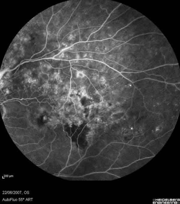 En el momento del diagnóstico se realizó una exploración oftalmológica completa incluyendo mejor agudeza visual corregida, biomicroscopía anterior, tonometría de aplanación, funduscopía con lente de contacto, no contacto y oftalmoscopía indirecta. Además de la siguientes pruebas de imagen: Retinografía en color, angiofluoresceingrafía mediante Heidelberg Scanning Laser Ophthalmoscope (Heidelberg Engineering, Heidelberg, Germany) y tomografía de coherencia óptica (OCT) mediante OCT 3000 scanner (Carl Zeiss Ophthalmic System, Inc., Humphrey Division, Dublin, CA).