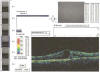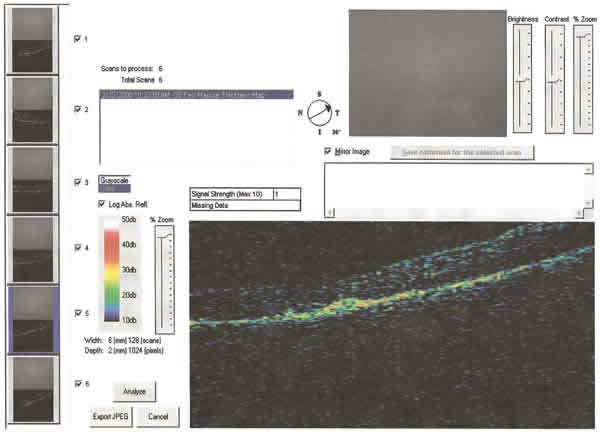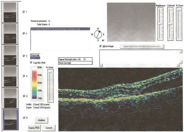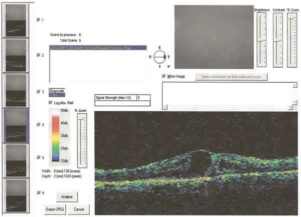 El CME fue definido angiográficamente como presencia de espacios quísticos hiperfluorescentes ovales o típicamente petaloides radiales a la fóvea. El fondo fue escaneado mediante cortes a través del centro foveal horizontal, vertical y 4 oblicuos, dentro de un área de 6 mm. Definimos mediante OCT(4), CME como la presencia de cavidades intrarretinianas hiporreflectantes (fig. 3) y DSR como la presencia de elevación de la superficie de la retina sobre una cavidad no reflectante por encima del epitelio pigmentario retiniano con mínima sombra sobre los tejidos subyacentes (fig. 4). El grosor macular total (CMT) es medido desde la superficie interna retiniana hasta el epitelio pigmentario. El intervalo entre la realización de OCT y la inyección intravítrea fue de 24 horas.