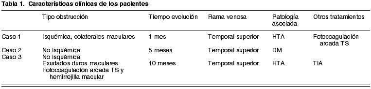En esta serie presentamos 3 ojos de 3 pacientes con obstrucción de rama venosa retiniana (BRVO). De ellos 1 mujer y 2 hombres, cuyas edades varían entre 77 y 82 años. Los criterios de inclusión fueron: Presencia de edema macular cistoide (CME) diagnosticado mediante funduscopía, secundario a BRVO, con confirmación angiográfica de los mismos (figs. 1 y 2), y presencia de CME y desprendimiento seroso neurosensorial (DSR) en la mácula documentado por tomografía de coherencia óptica (OCT).