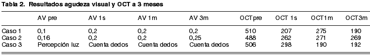 En el seguimiento los pacientes fueron explorados a las 24 horas y 1 semana; la respuesta clínica y anatómica al tratamiento fue monitorizada a los 1, 3, 6 y 12 meses mediante agudeza visual (AV) y OCT, además de la exploración oftalmoscópica completa.