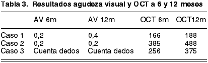 Al paciente 1 se le realizó capsulotomía Nd YAG, mejorando su AV sin empeoramiento del edema macular, sin embargo el caso 2 fue retratado en dos ocasiones por recidiva del edema y el caso número 3 se encuentra propuesto para cirugía de catarata con inyección de antiangiogénicos por recidiva del edema y aumento de la tensión intraocular después de la segunda inyección de corticoides intravítreos.