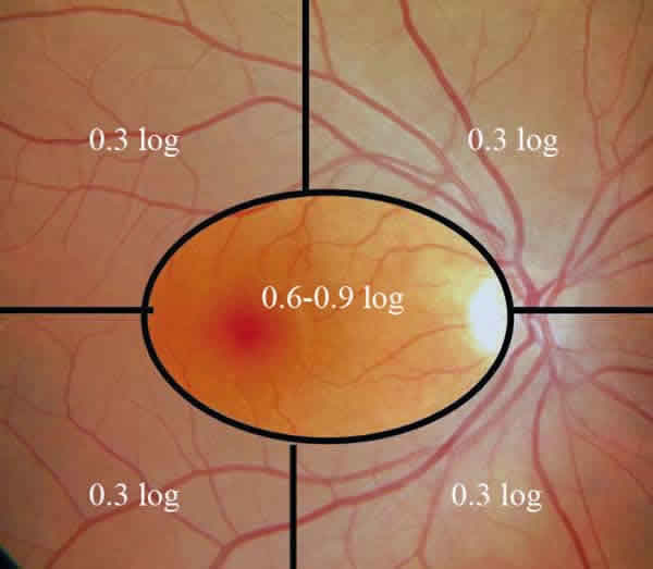 Por su sencillez e inmediatez, y por ser una de las pocas pruebas no simulables en el campo de la neuroftalmología el DPAR resulta de una extraordinaria utilidad en el campo de la simulación. Cuando un sujeto refiere una pérdida campimétrica unilateral severa debe estar presente un DPAR. Para orientarnos sobre la cuantía de este defecto, debemos recordar que una lesión extensa del polo posterior genera un DPAR de entre 0,6 y 0,9 unidades logarítmicas, y la afectación de cada uno de los cuadrantes 0,3 unidades logarítmicas (fig. 4). Por ello un sujeto que refiere una pérdida de medio campo visual debe presentar un DPAR del orden de 1 unidad logarítimica (fig. 5).