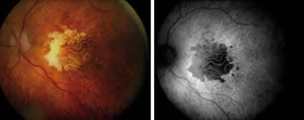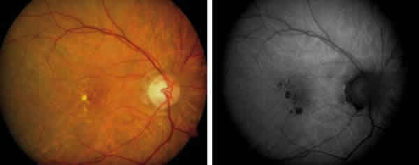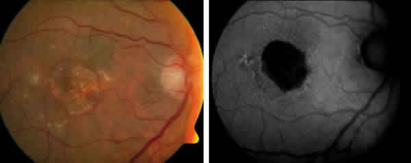 Fig. 3: Retinografía e imagen de autofluorescencia de una lesión geográfica de