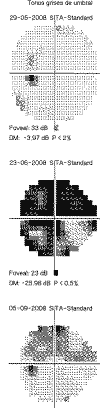 Fig. 3: Campimetría del OI en diferentes fases del episodio actual, mostrando
