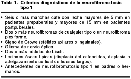 Debido a los antecedentes familiares que presentaba nuestra paciente, el primer diagnóstico de sospecha fue la neurofibromatosis tipo 1 (NF-1), que asocia en un 10% displasia unilateral del esfenoides y que puede constituir una de las primeras manifestaciones clínicas de dicha enfermedad (1). La paciente debía cumplir 2 de los 7 criterios diagnósticos de NF-1 (tabla 1) para que el cuadro fuera catalogado como tal. En nuestro caso esos 2 criterios serían una lesión ósea característica (como la displasia unilateral del esfenoides, o la displasia o el adelgazamiento cortical de huesos largos), y tener un pariente de primer grado afectado de NF-1. Sin embargo, nuestra paciente presenta una displasia bilateral y además se le realizaron dos estudios genéticos diferentes en los que se afirma que no es portadora de la mutación del haplotipo paterno responsable de la NF-1. A pesar de no ser portadora de dicha mutación, más del 50% de los casos de neurofibromatosis tipo 1 corresponden a mutaciones de novo (2). Si bien no tenemos pruebas concluyentes de la relación de la displasia fibrosa de esfenoides con la NF-1 en esta paciente, la coincidencia de ambos procesos en su familia puede parecer algo más que casual.