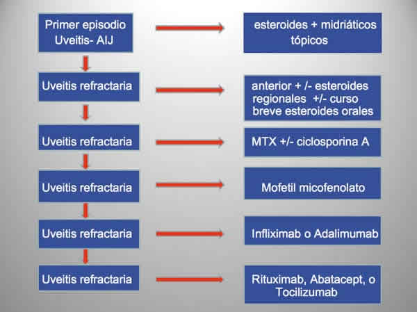 Fig. 4: Protocolo terapéutico de la uveítis anterior crónica asociada a AIJ.