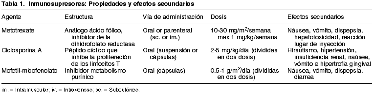 – Mofetil micofenolato: este fármaco puede ser efectivo en controlar la inflamación tras fracaso del metotrexate o intolerancia de éste. La dosis es de 0,5-1 g/m2/día en dos tomas. Puede utilizarse en monoterapia o asociado a ciclosporina A.