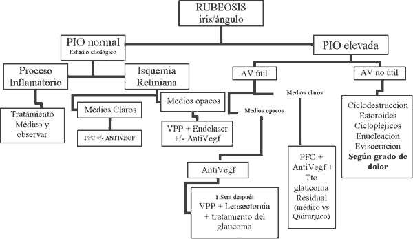 Fase de rubeosis (estadio preglaucomatoso). Se caracteriza por PIO normal. Se puede observar fina rubeosis. El ángulo puede estar neovascularizado o no pero siempre está abierto.