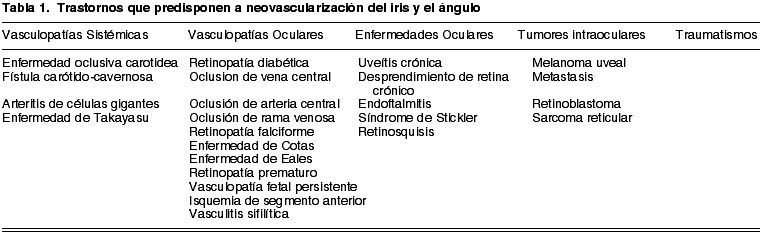 El GNV es un tipo de glaucoma por cierre angular segundario sin bloqueo pupilar. Se trata de un cuadro clínico derivado de una situación de isquemia retiniana o de inflamación intraocular que pueden tener diferentes orígenes (tabla 1). Las causas más frecuentes son la diabetes mellitus, oclusión de la vena central de la retina y síndrome isquémico ocular.