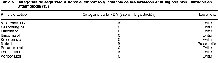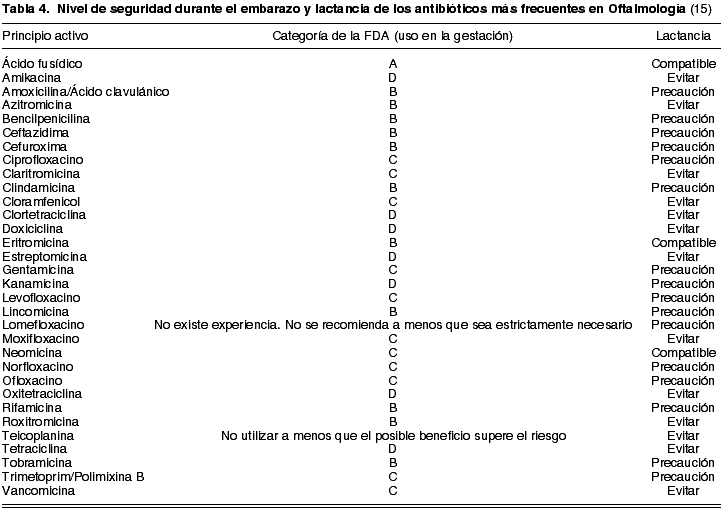 En la actualidad existe una gran cantidad de fármacos antiinfecciosos disponibles para uso oftálmico. Los fármacos que sean utilizados durante la gestación no deberían sobrepasar las categorías A y B de seguridad propuestas por la FDA. De este modo, de los antibióticos de uso frecuente en Oftalmología, ha mostrado un nivel de seguridad A únicamente el ácido fusídico. El nivel B lo presentan todas las penicilinas (como la amoxicilina y bencilpenicilina) y cefalosporinas (ceftazidima y cefuroxima, entre otras); la tobramicina como único aminoglucósido; eritromicina, azitromicina y roxitromicina, dentro del grupo de los macrólidos; las lincosaminas (lincomicina y clindamicina); y la rifampicina, como fármaco antimicobacteriano (tabla 4).