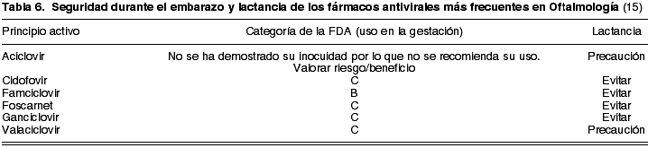 Excepto el famciclovir que exhíbe categoría B, el resto –aciclovir, ganciclovir, valaciclovir, foscarnet, cidofovir– son C. Asimismo, el ganciclovir, famciclovir, foscarnet y cidofovir deben evitarse durante la lactancia, pudiendo utilizarse el resto tras valorar los riesgos y beneficios, aunque con cautela (tabla 6).