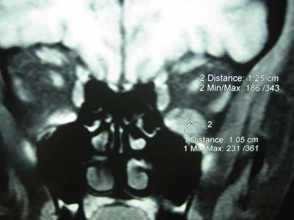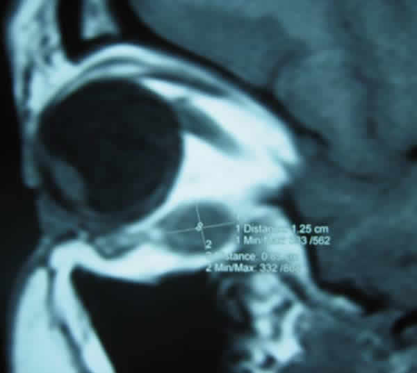 Aporta un estudio de resonancia magnética nuclear (RMN) de órbitas con administración de Gadolinio en cortes axial, coronal y sagital en el que se aprecia una tumoración que expande el tercio central del músculo recto inferior, con diámetros craneocaudal, anteroposterior y lateromedial de 1,5x2x1 cm, que se realza con contraste de forma irregular (figs. 1 y 2).