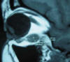 Aporta un estudio de RMN de órbitas en cortes axial, coronal y sagital con inyección de Gadolinio, objetivándose una masa intracónica en el cuadrante nasal y superior de la órbita izquierda en íntimo contacto con el nervio óptico y los músculos oblicuo mayor, recto superior y recto interno en sus 2/3 anteriores, con diámetros transverso, antero-posterior y vertical de 1,7x1,3x1,2 cm, considerándose el hemangioma intracónico la principal posibilidad diagnóstica (fig. 4).