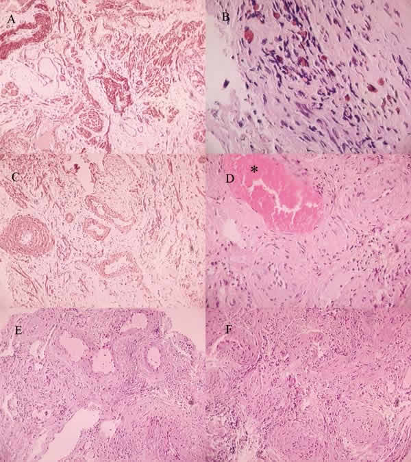 endoteliales. B: Hematoxilina-eosina (H-E 40x) Pigmento hemosiderínico. C: