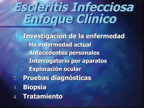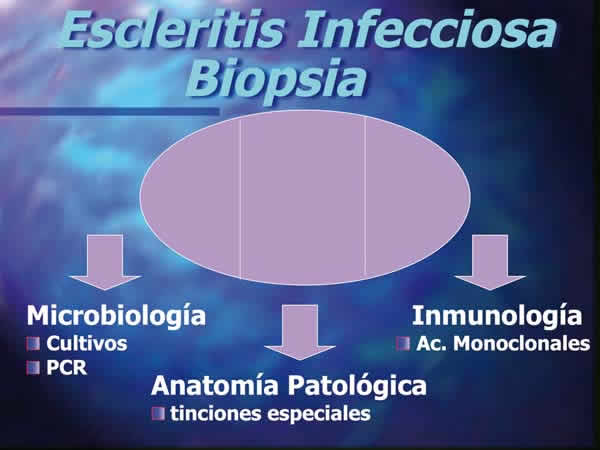 Si se sospecha una escleritis infecciosa exógena deben realizarse raspados para tinciones, cultivos y PCR de la conjuntiva que cubre la esclera afectada y de la córnea si es que ésta está afectada.