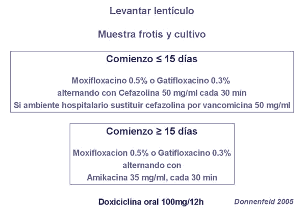 El tratamiento se inicia luego de forma empírica según las pautas descritas a continuación y/o guiados por los resultados de la tinción de las extensiones si fue posible realizarlas. La modificación del tratamiento se basa en la respuesta clínica y los resultados de los cultivos. El White Paper de la ASCRS recomienda distintas combinaciones según la infección sea de comienzo precoz o tardío (fig. 1). Este tratamiento no cubre infecciones por hongos, por lo que el resultado ha de modificarse luego según los resultados de los cultivos (15).