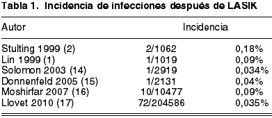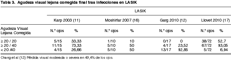 Entre un 10 (58) y un 14,5% (13) de las infecciones después de LASIK requieren tratamiento quirúrgico mediante queratoplastia.
