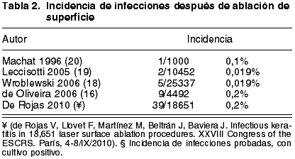 Recientemente hemos presentado la serie más numerosa de casos tras cirugía de superficie, que incluye 39 casos de 38 pacientes en 18651 procedimientos, lo que arroja una incidencia de un 0,2%, o de 1 caso en 500 procedimientos. Si tenemos sólo en cuenta los casos con cultivo positivo (13 casos), entonces la incidencia de infecciones probadas sería de un 0,06%. Aunque se excluyeron del estudio los casos compatibles con infiltrados estériles, tratándose de un estudio retrospectivo, sería posible que alguno de los casos con cultivo negativo no fuese de etiología infecciosa (de Rojas V, Llovet F, Martínez M, Beltrán J, Baviera J. Infectious keratitis in 18,651 laser surface ablation procedures. XXVIII Congress of the ESCRS. París, 4-8/IX/2010). La incidencia de infecciones totales es similar a la publicada por Machat (20) y de Oliveira (21), pero es 10 veces mayor que la estimada por Wroblewski (18) o Leccisotti (19). La razón de una menor tasa de infección en las series de Wroblewski y Leccisotti no está clara. Ambos son estudios retrospectivos y pueden no haberse recogido ciertos casos de infección. En particular, la serie de Wroblewski incluye los casos de infección tras cirugía de superficie en 6 centros de la Armada Americana y sería posible que infraestimase la incidencia si el paciente se destina a otro lugar. Por otro lado, nuestra tasa de infecciones tras LASIK es de las más bajas de la literatura. Dado que la institución, protocolos y período de estudio es el mismo, nuestra tasa de infección tras cirugía de superficie no debería ser mayor que la de otros centros. Esto también sugiere que las series que muestran menor tasa de infección tras cirugía de superficie podrían estar infraestimando la incidencia.