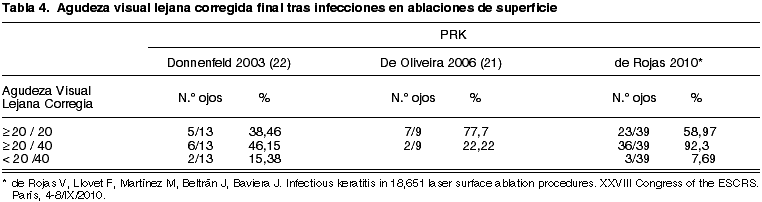 Los resultados visuales finales de nuestra serie de infecciones en ablación de superficie son iguales o ligeramente mejores que los publicados por otros autores (tabla 4).