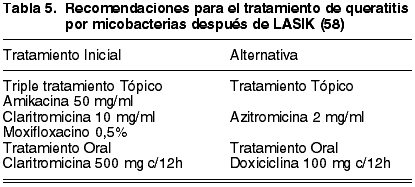 Por todo lo expuesto anteriormente, la mayoría de los casos de infecciones por micobacterias no tuberculosas (49%) precisan tratamiento con varios antibióticos simultáneamente (58) y se recomienda iniciar el tratamiento con terapia triple según lo indicado en la tabla 5, añadiendo tratamiento con antibióticos orales (claritromicina o doxiciclina). El tiempo desde el diagnóstico hasta la resolución de los síntomas es prolongado, 71,5 días de media (11). En la revisión de literatura realizada por John, un 54% de los casos precisaron amputación del lentículo y 4 requirieron queratoplastia (58).