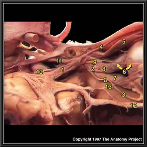 12, Nervio infraorbital. 13, Comunicación entre los nervios zigomático-facila y