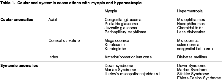 Finally, myopia has been associated to some ocular anomalies and systemic diseases (table 1) due to changes in the corneal curvature, in the lens refraction index or in the ocular axial length. For example, in the Marfan syndrome two possible responsible mechanisms have been described: anterior migration of the irido-lens diaphragm that anteriorly displaces the focal point of the eye and the lens thickening that increases its refractive power (33). Alterations of the elastic component of the sclera and the cornea could also cause an increase of the axial length and therefore myopia (34). A similar mechanism would account for the development of myopia in other connective tissue diseases.