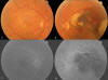 La imagen en la angiofluoresceingrafía (AFG) muestra tortuosidad vascular marcada en ambos ojos (AO), zona de hipofluorescencia en polo posterior (efecto pantalla secundario a hemorragia) con zona de hiperfluorescencia tardía, sugestiva de membrana neovascular subretiniana (fig. 1C y D). La reabsorción progresiva de la hemorragia deja ver una placa de fibrosis blanquecina en polo posterior y alteraciones pigmentarias en la zona de la hemorragia (fig. 2), y la AV mejora a 0,1 en OI.