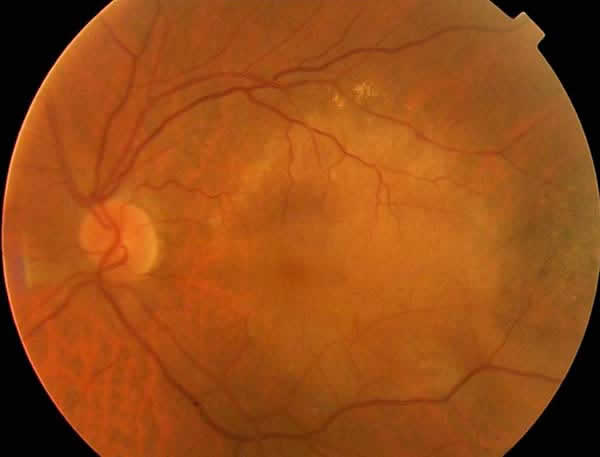 zona macular correspondiente a la placa de fibrosis previa permanece plana.